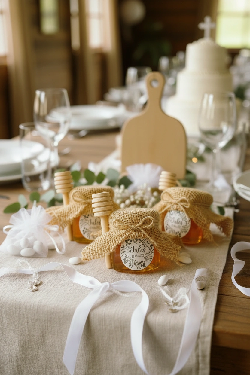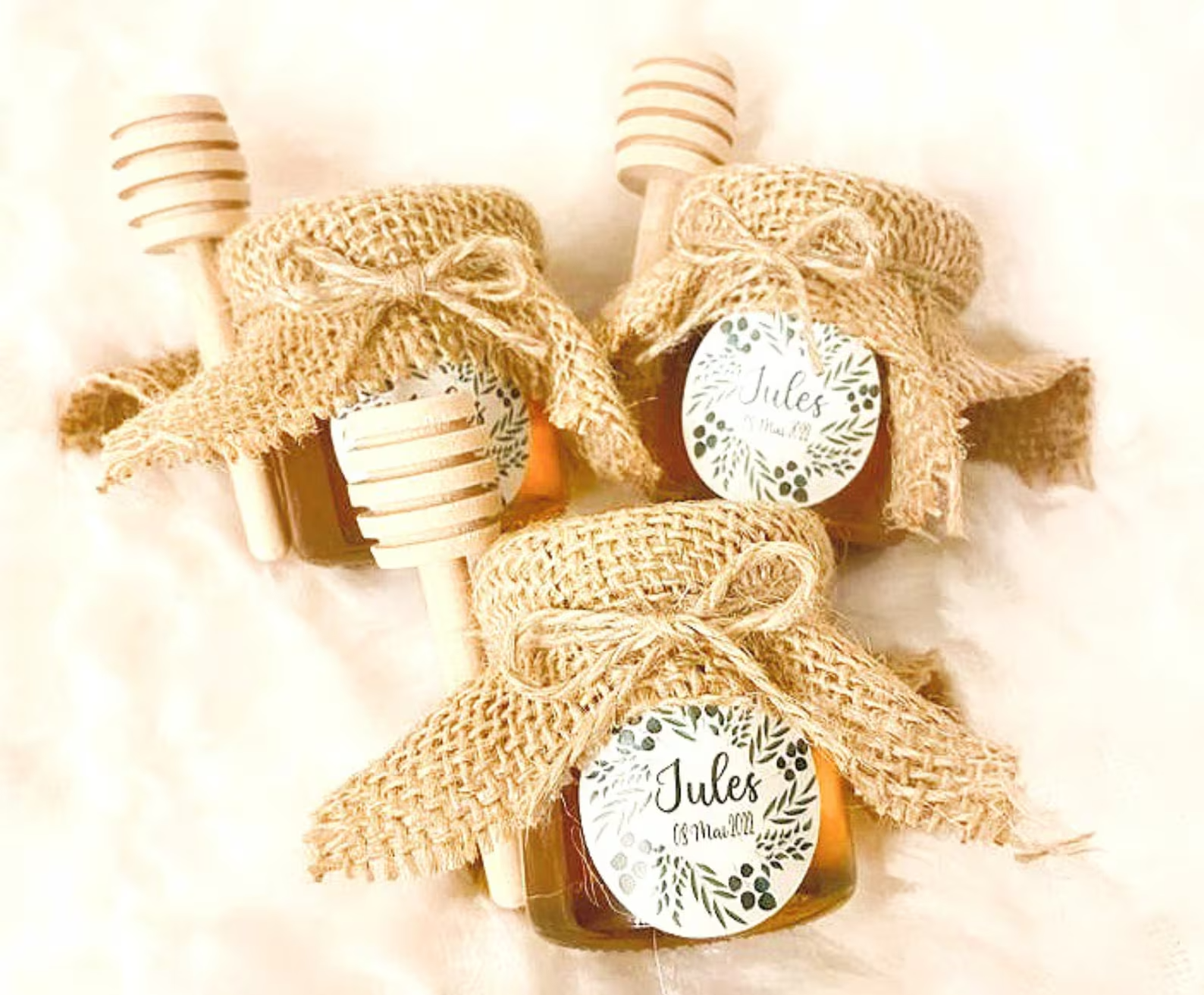 Pot de miel personnalisé avec cuillère en bois pour vos invités de mariage, baptêmes et autres événements vendu par lot de 10 pots.
